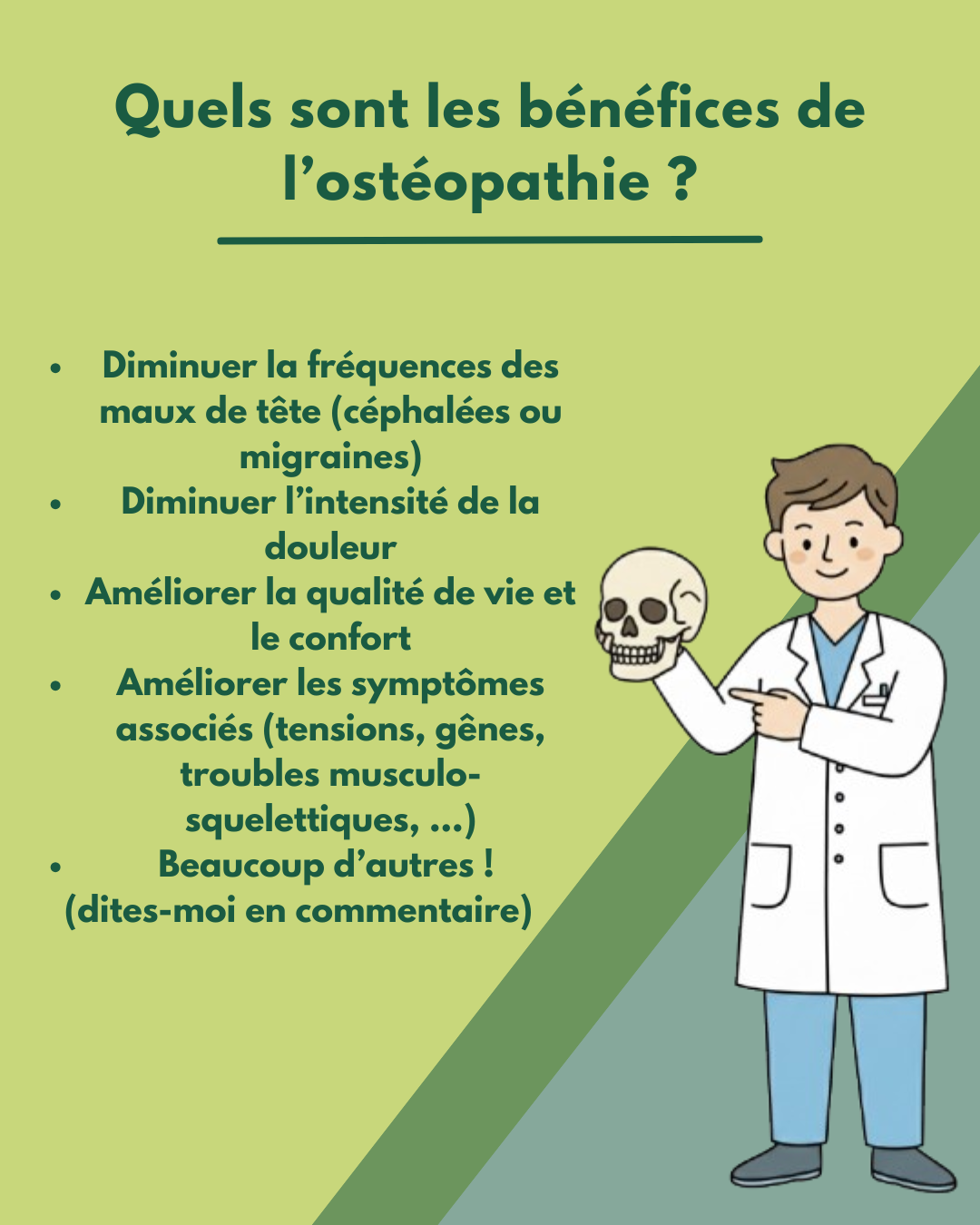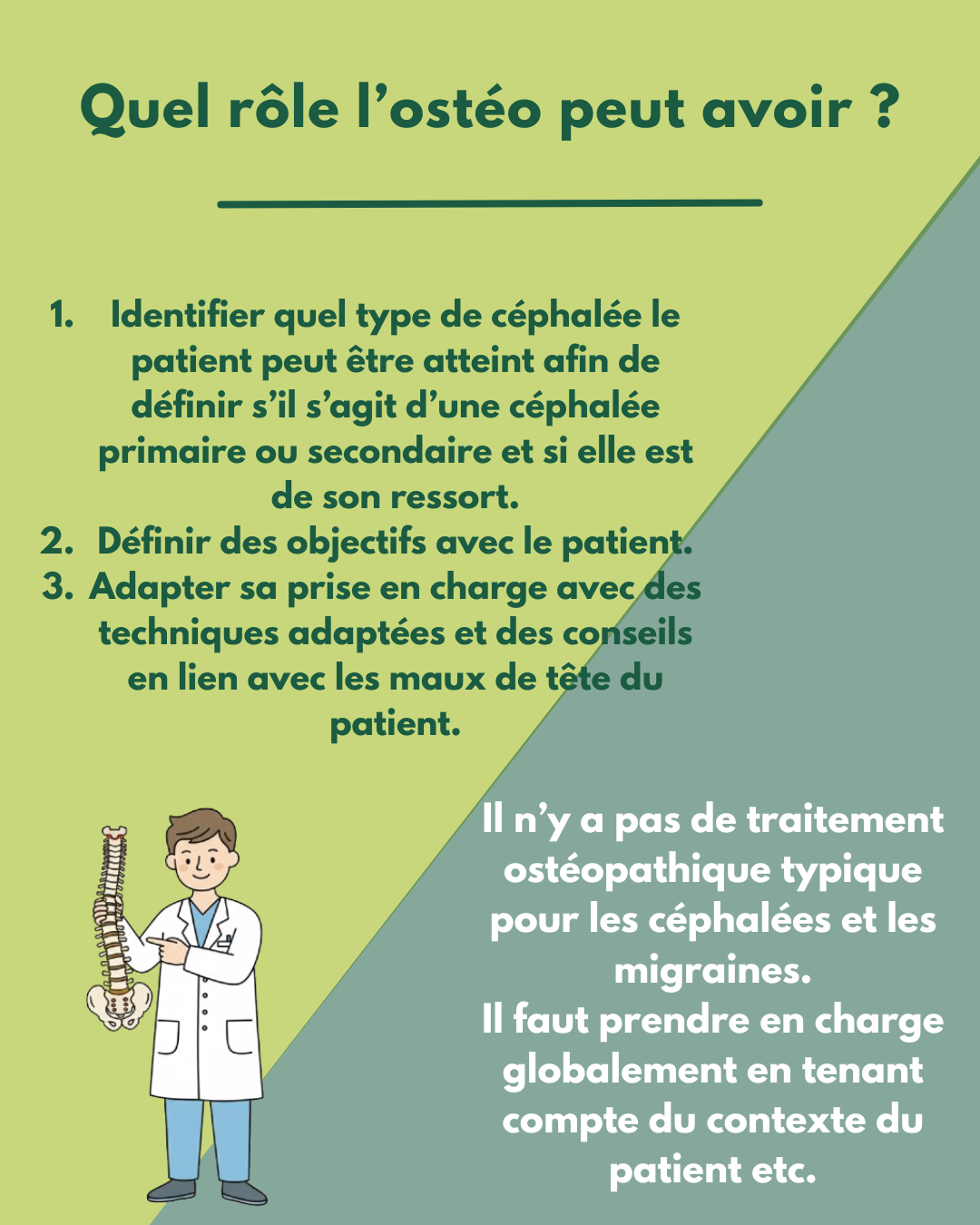 L’ostéopathe peut également mieux évaluer les facteurs environnementaux (ergonomie du poste de travail, literie, etc.) qui peuvent contribuer à vos douleurs, et ainsi vous donner des conseils plus personnalisés pour améliorer votre quotidien.